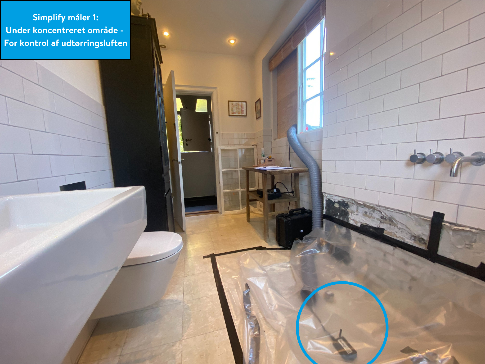Fx blev systemet anvendt på en sag, hvor en affugter skulle stå på et badeværelse. Adsorptionsaffugteren, der blev brugt på stedet, puster med meget lav luftfugtighed og kan potentielt trække lofter og gulve og/eller møbler fra hinanden.