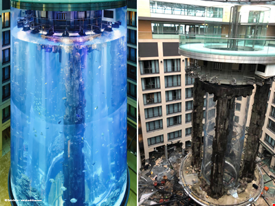 Das Aquarium war geplatzt. Eine Flutwelle spülte die riesigen Wassermengen, Trümmerteile und Fische durch die Lobby bis auf die noch menschenleere Straße Nähe des Alexanderplatzes. Das Salzwasser beschädigte auch die umliegenden Gebäude, Geschäfte und Straßen, lief in Keller und benachbarte Einrichtungen. Insgesamt erstreckte sich der Wasserschaden auf 28.000 Quadratmeter, fast vier Fußballfelder.