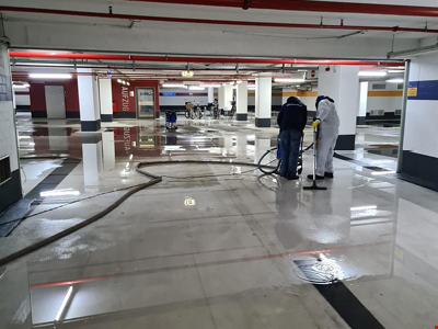 Nachdem die aufwendigen Sicherungs- und Sofortmaßnahmen größtenteils vollendet waren, begannen wir mit den Trocknungsarbeiten. Über eine Million Liter Salzwasser hatten sich von der Hotel-Lobby bis in das dritte Untergeschoss des Hotels ausgebreitet. Insgesamt vier Etagen mit einer Gesamtfläche von 7.000 m² waren betroffen. Bevor die hinterbliebenen Wassermengen abgesaugt und die Kellerschächte leergepumpt werden konnten, begannen wir mit den Sicherheitsmaßnahmen in den unteren Etagen. Unsere Teams befreiten die elektrischen Schalt- und Lüftungsanlagen von Schmutzwasser und stellten einen zusätzlichen Schutz gegen das Eindringen der hinterbliebenen Wassermengen her.