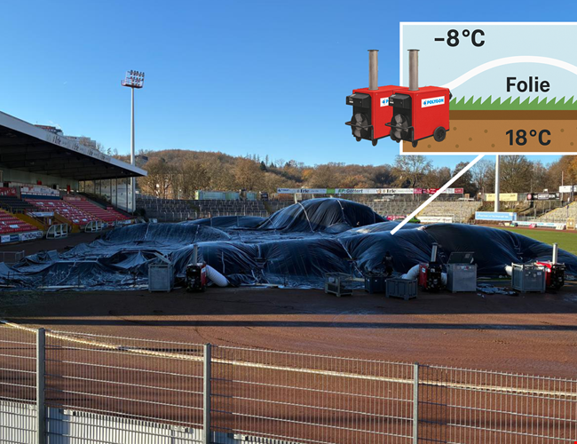 Um ein Durchfrieren zu verhindern, kamen sechs Großheizgeräte mit jeweils 185 kW Leistung zum Einsatz. Die kontrollierte Warmluftführung unter der Folie stabilisierte die Temperatur im kritischen Bereich auf bis zu 18 °C. Der Rasen blieb weich, elastisch und damit bespielbar.