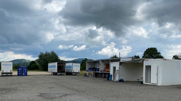 To be able to manage this huge project with combined forces, the logistic center in Olpe provided 4 trucks with all the necessary equipment. The temporary emergency branch consisted of, among other things, team containers, sanitary facilities, and office space for better coordination of operations.