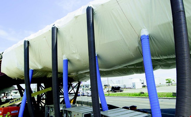 Work was done during the nighttime hours, the highway below the project area was closed temporarily, and five DX units were placed on both sides of the roadway. They were then ducted into containment. The concrete pour required intensive monitoring of both the temperature and movement of the steel – only 2.5 millimeters of movement was allowed as part of the control.