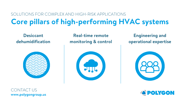There are a number of design features built into dry rooms to ensure their performance and reliability. Engineers consider all aspects including the materials used for walls, door access and vestibules or airlocks, and ventilation. Of particular importance is HVAC system. There are 3 core pillars of a reliable and high-performing HVAC system for dry rooms: desiccant dehumidification, real-time environmental monitoring and control, and engineering and operational expertise.
