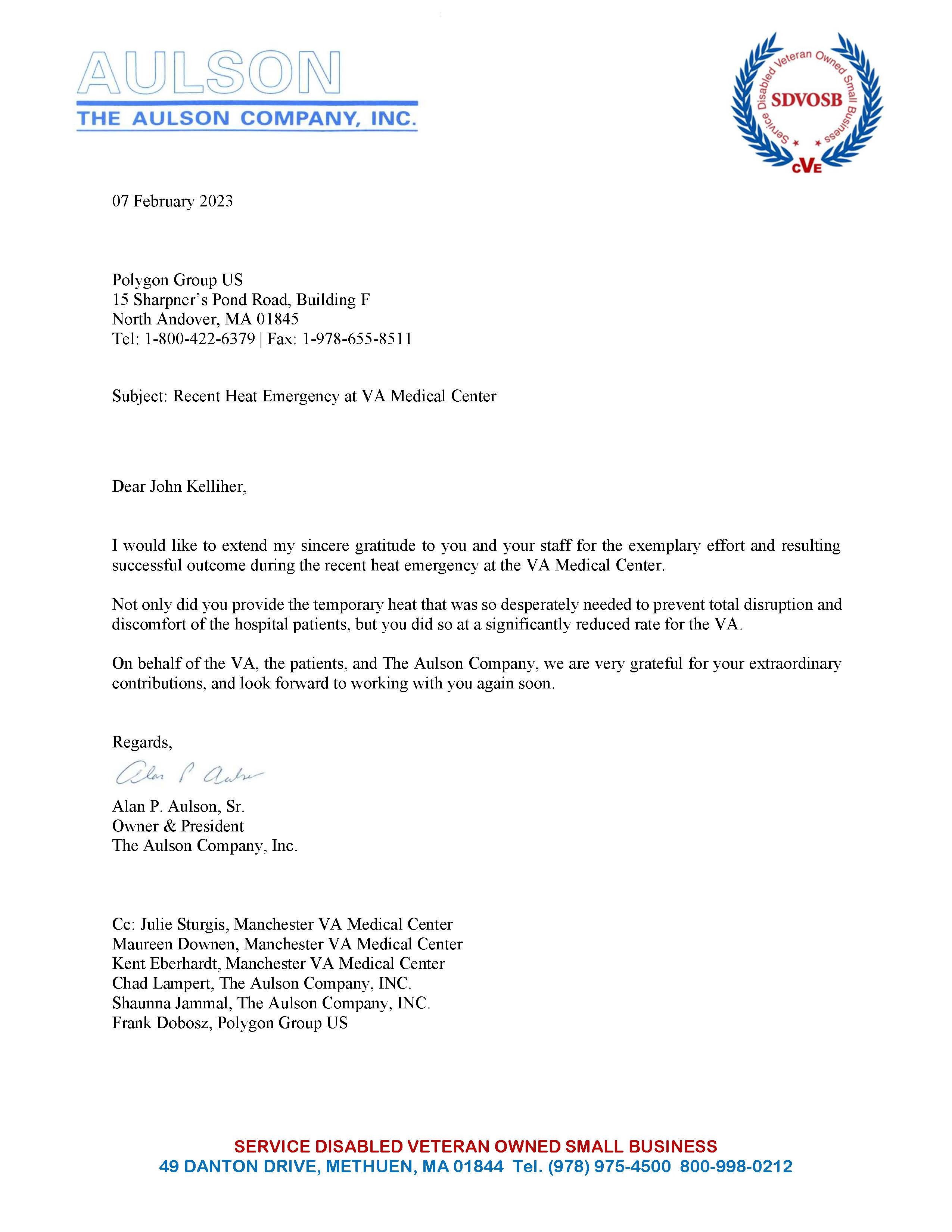 I would like to extend my sincere gratitude to you and your staff for the exemplary effort and resulting successful outcome during the recent heat emergency at the VA Medical Center. Not only did you provide the temporary heat that was so desperately needed to prevent total disruption and discomfort of the hospital patients, but you did so at a significantly reduced rate for the VA. On behalf of the VA, the patients, and The Aulson Company, we are very grateful for your extraordinary contributions and look forward to working with you again soon.