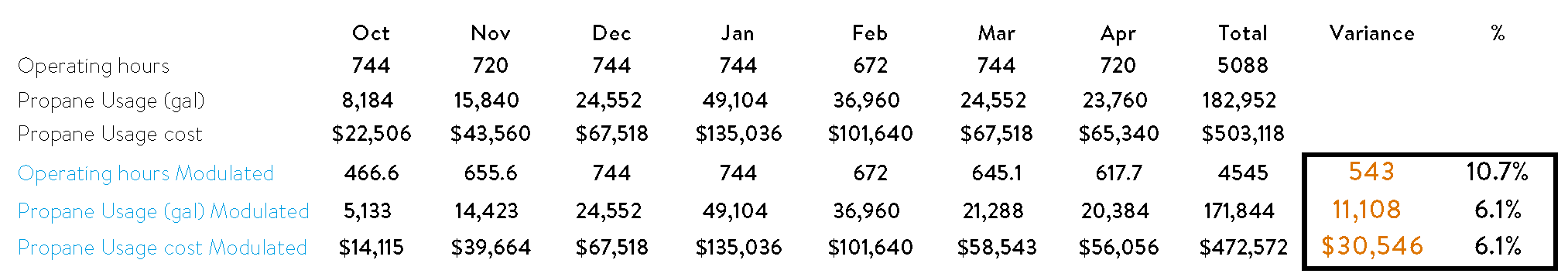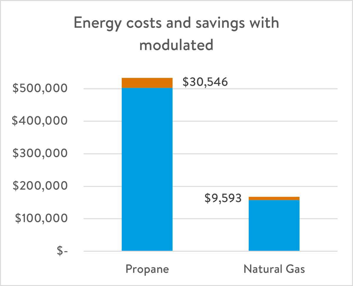 Reducing heater operating time by 10% could save the project 11,108 gallons of propane and $30,546 of costs, an overall 6.1% savings. And with less energy burned there is a reduction in carbon emissions and smaller impact on the environment.