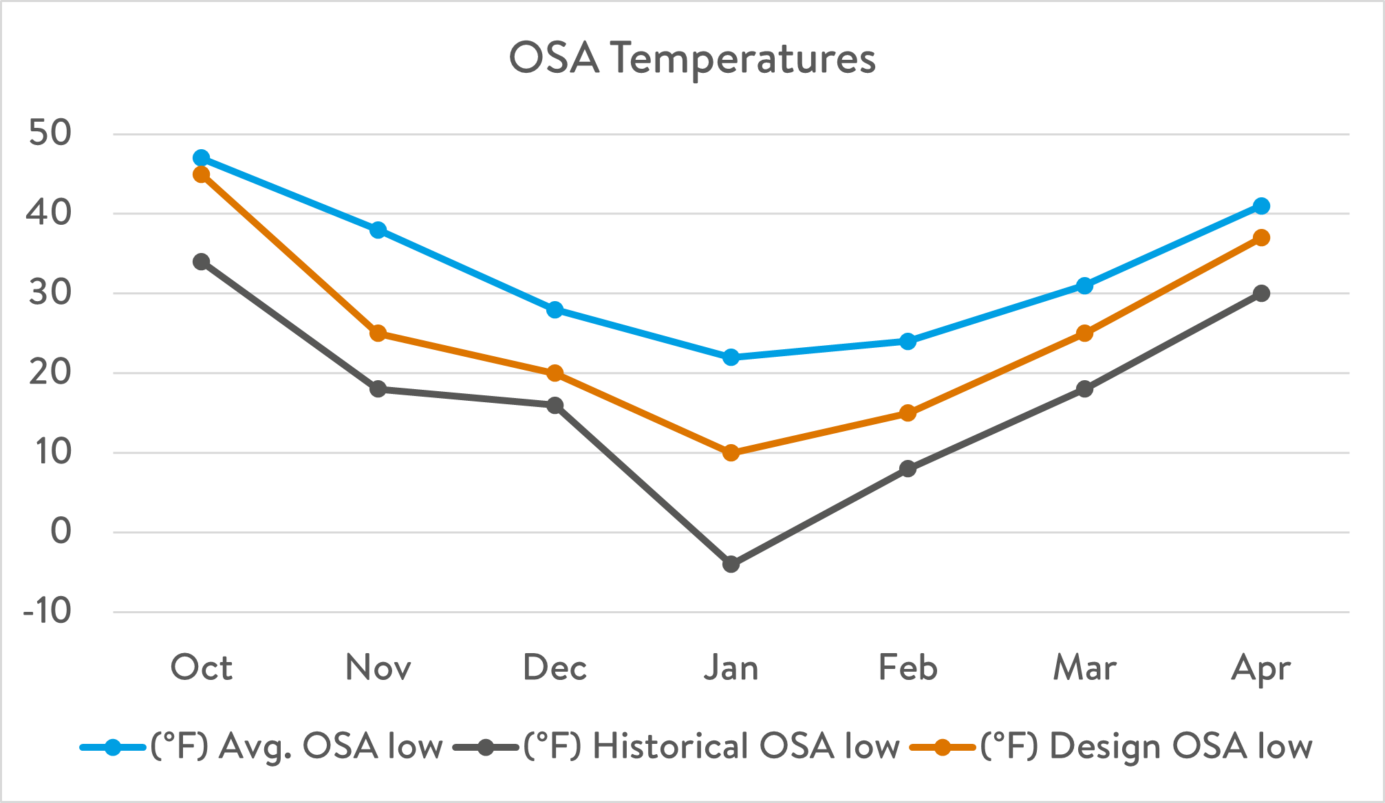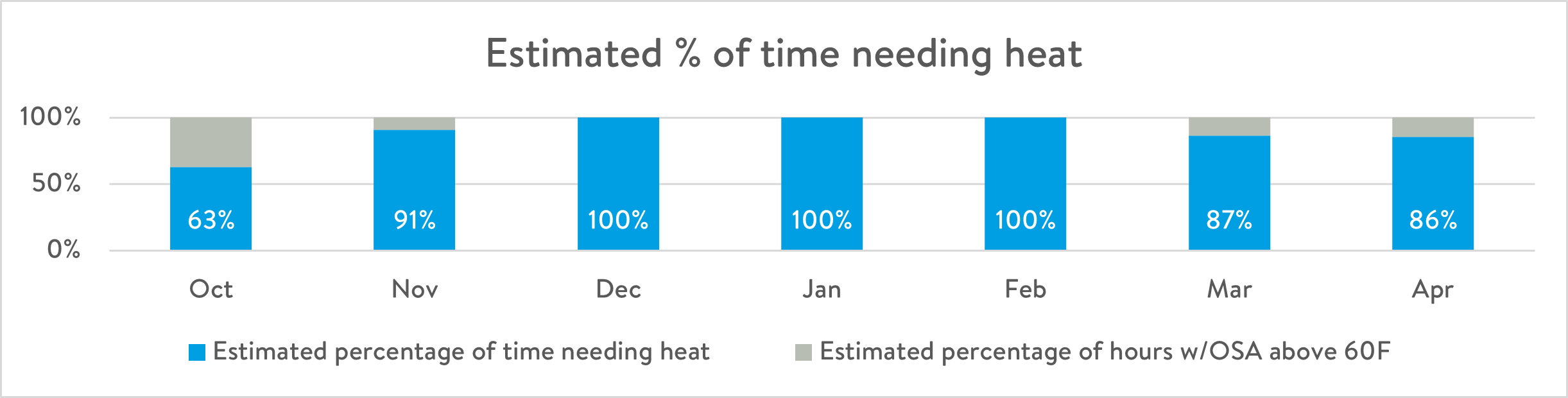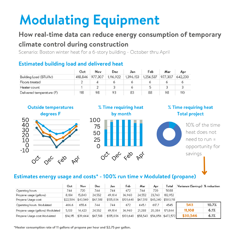 Let's walk through a possible scenario. Imagine a 6-story construction project in Boston during the winter season. Crews will be working on the building from the first floor up starting in October and through April. For this example, we will look at heat only, so it is easiest to see the impact. The ideal amount of delivered heat required will change over time. The outside average temperature will fluctuate while at the same time crews will expand work to more floors.