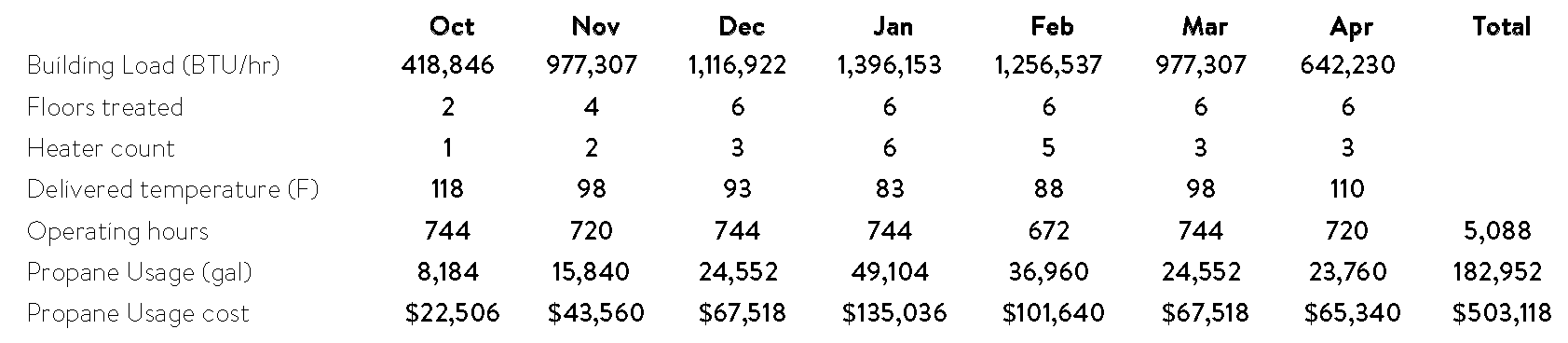 Assuming we are running 100% of the time, there are a total of 5,088 operating hours. Yes, technicians can go onsite to manually turn equipment on and off, but this is not a typical approach because it introduces risk and cost. Based on a propane consumption rate of 11 gal/hour, the necessary heaters will burn 182,952 gallons of propane.