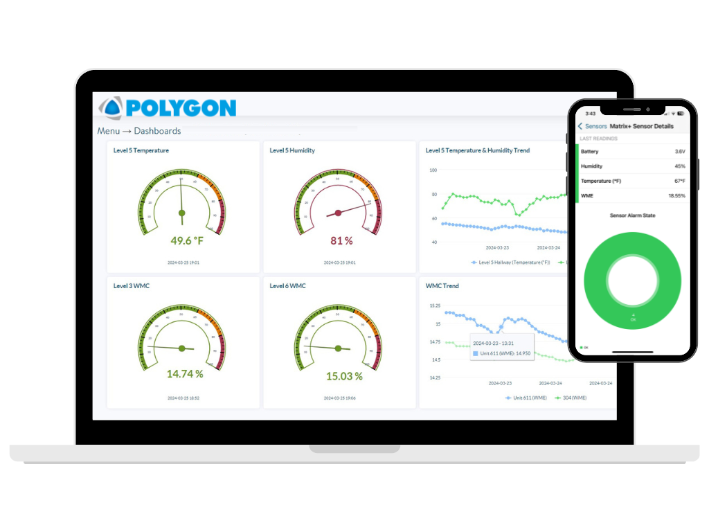 Polygon helps the project teams ensure proper building acclimation and moisture management of mass timber structures. With real-time environmental and wood moisture monitoring coupled with high-performance equipment, contractors have 24/7 visibility and control of the space protecting materials and their schedule.