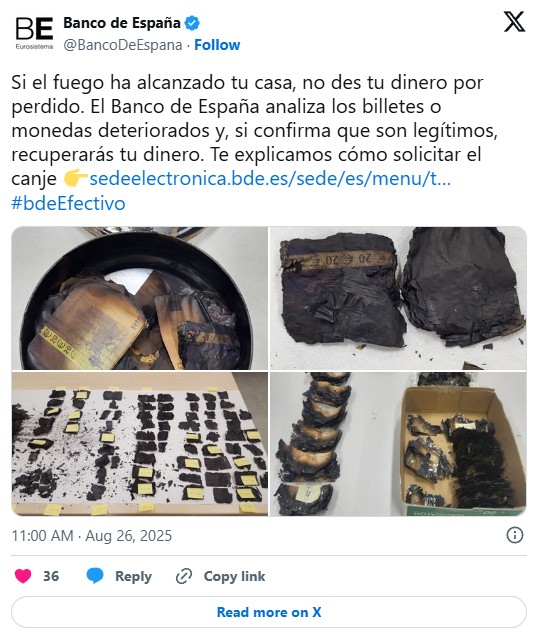 Il Banco de España consente la sostituzione o il rimborso delle banconote e monete danneggiate o bruciate, purché si rispettino specifici requisiti. Ecco i passaggi da seguire: