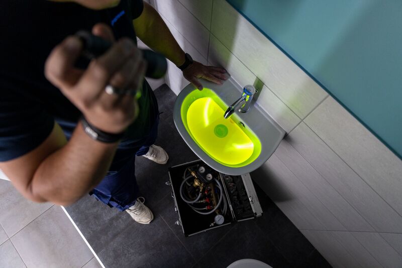 - Coloranti: questo metodo coinvolge l'aggiunta di coloranti tracciatori, spesso sotto forma di liquidi colorati o fluorescenti, all'acqua del sistema. Il principio di base di questa tecnica è semplice ma efficace: quando l'acqua contenente il colorante viene introdotta nel sistema, essa inizia a scorrere attraverso le tubazioni. Qualora ci fossero delle perdite, il colorante inizia a fuoriuscire e a mescolarsi con l'acqua circostante. Questo crea un evidente cambiamento di colore nell'acqua, rendendo immediatamente visibili le perdite. I coloranti tracciatori sono sicuri per l'ambiente e non rappresentano alcun rischio per la qualità dell'acqua potabile.