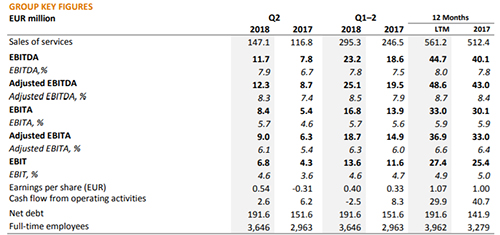 - Cash flow from operating activities totalled negative EUR 2.5 million, compared with positive EUR 8.3 million last year due to increased level of working capital. The liquidity buffer amounted to EUR 58.9 million (Dec 2017: 60.9).