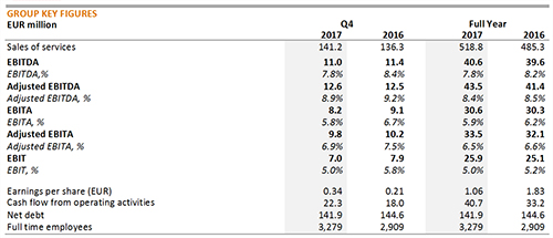 - Four add-on acquisitions were closed and consolidated during the period (Sweden, Norway and France). Two acquisitions were closed in January 2018 (Dansk Bygningskontrol and Von Der Lieck). Combined pro forma sales for the six acquisitions amounted to approximately EUR 65 million.