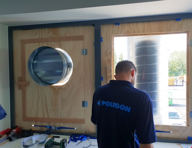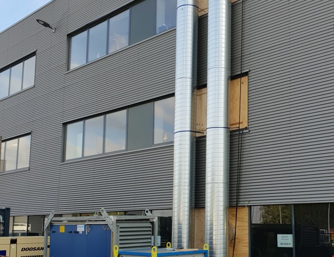 Zoals gezegd stoppen de werkzaamheden niet bij het reguliere herstel van de brand -en waterschade. Op verzoek van de contra-expert maakt de ervaren Eddy van Oers, Regiomanager Tijdelijke klimaatoplossingen bij Polygon, een offerte voor de tijdelijke klimaatbeheersing in beide bedrijfspanden. "Het feit dat wij met ons team van specialisten een compleet systeem aan kunnen leggen, dat maanden meekan, maakte mede dat wij als Polygon werden ingeschakeld voor deze klus", geeft Eddy van Oers aan. Hij vult aan: "De externe luchtbehandelingskasten langs de gevel zijn per verdieping aangesloten op de mechanische ventilatie, waardoor iedere verdieping is verzekerd van een eigen toevoer van gekoelde en verwarmde lucht – dit totdat het vaste systeem is vervangen."