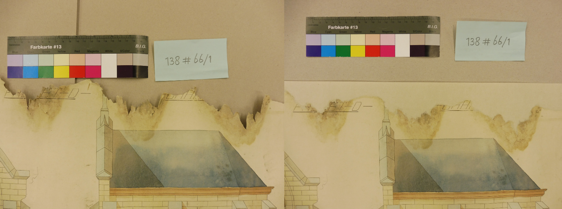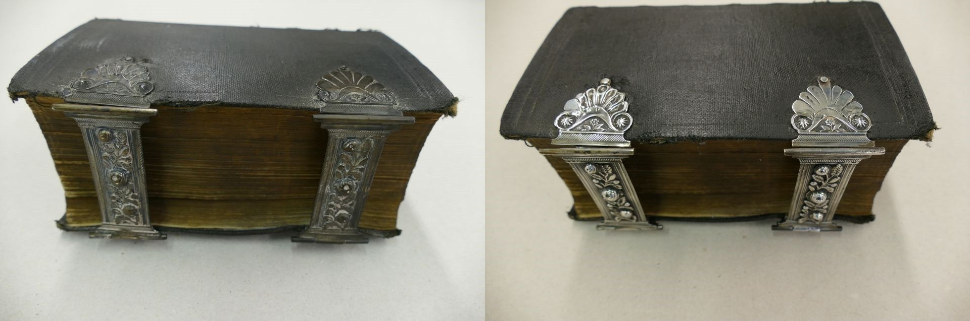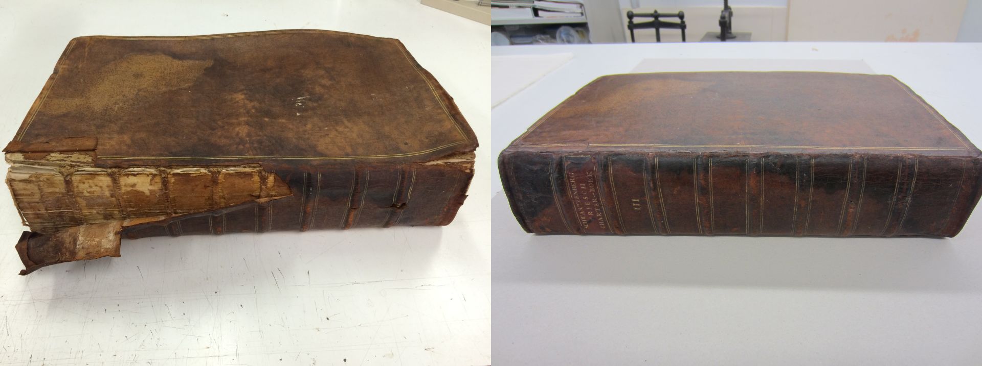 This calfskin book binding suffered water damage, the boards were wavy, and the spine was damaged and broken. The book's cover was flattened using a slightly damp sandwich. The damage to the leather was repaired with self-colored calfskin and colored Japanese paper.
