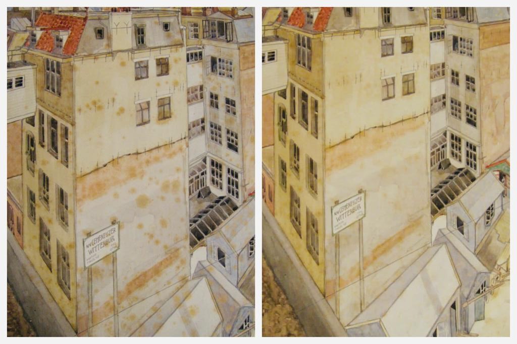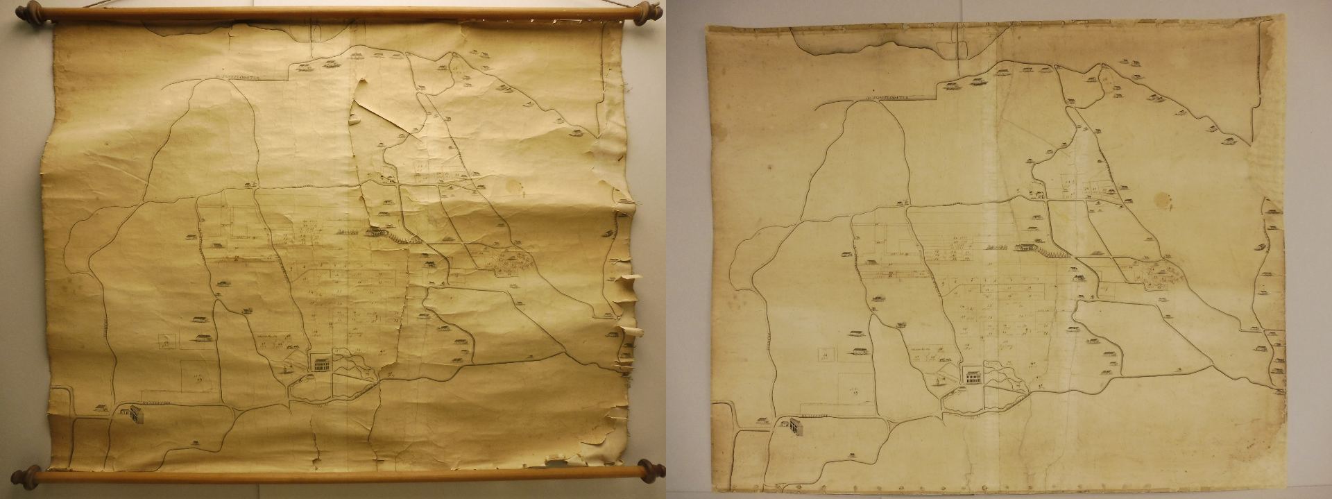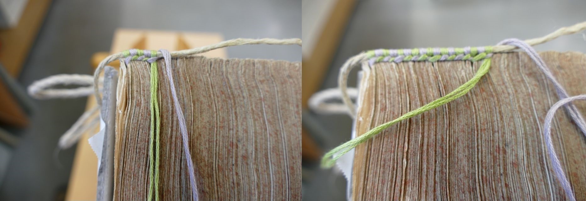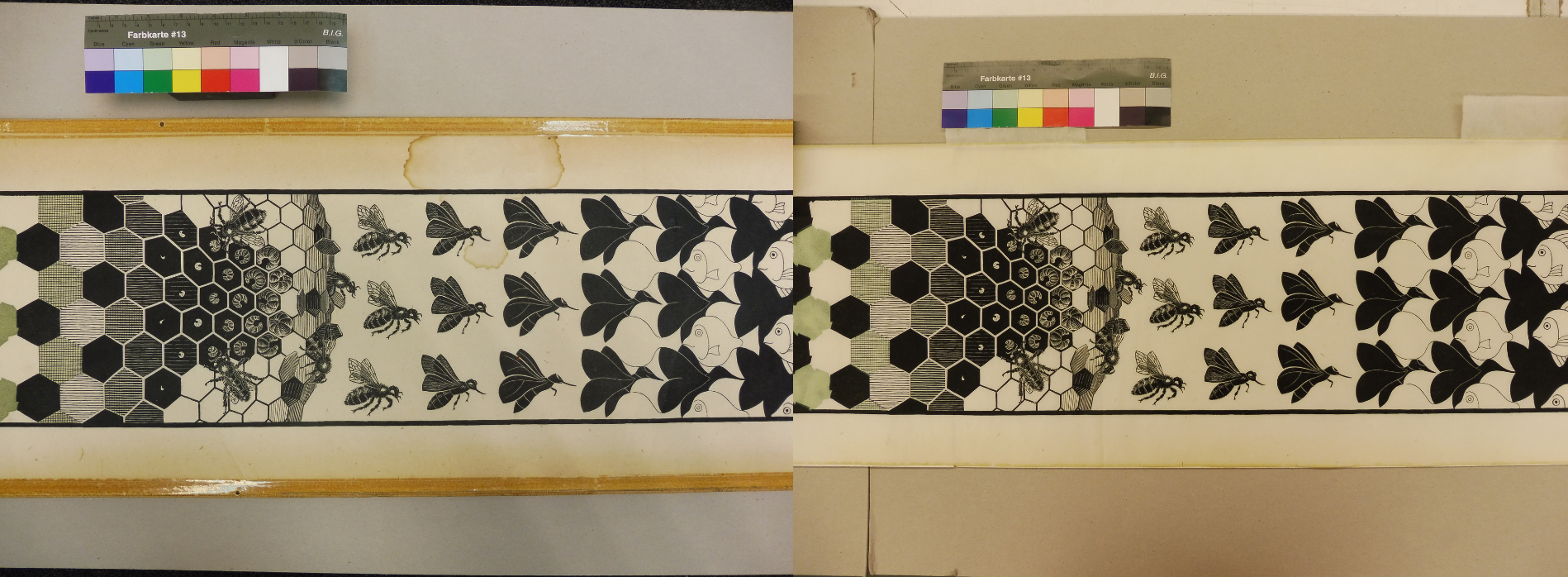 This calfskin book binding suffered water damage, the boards were wavy, and the spine was damaged and broken. The book's cover was flattened using a slightly damp sandwich. The damage to the leather was repaired with self-colored calfskin and colored Japanese paper.