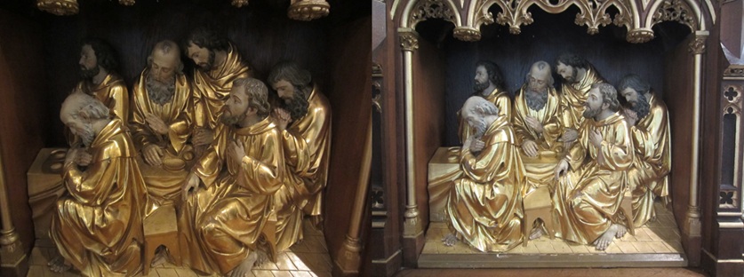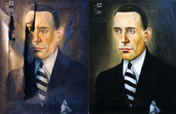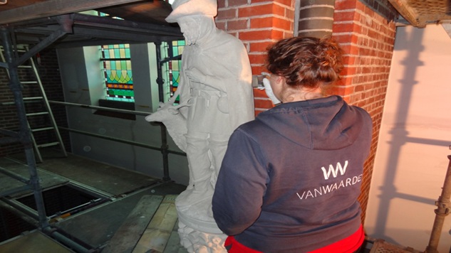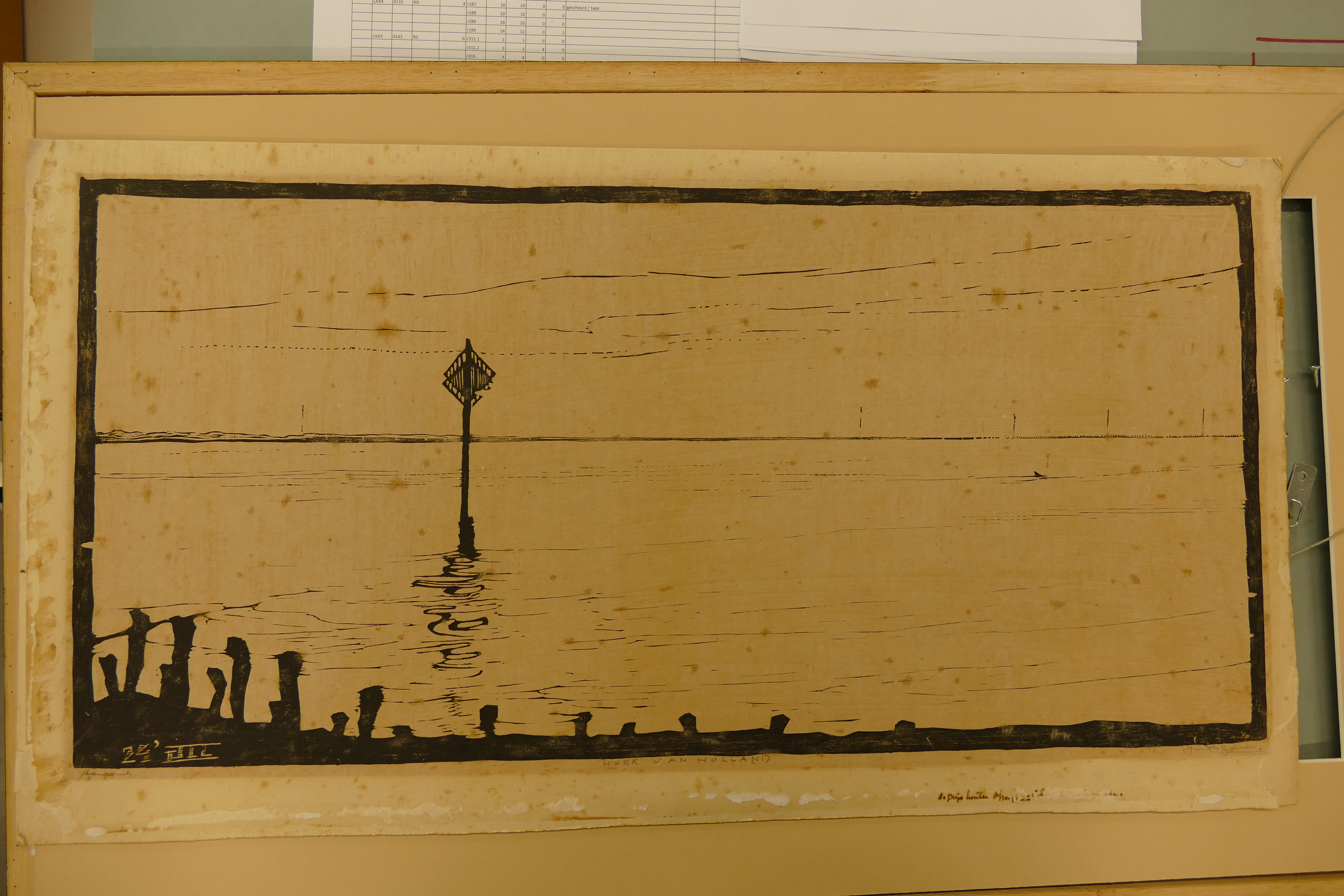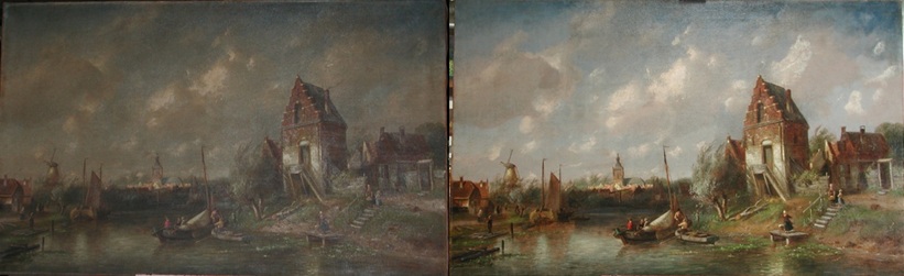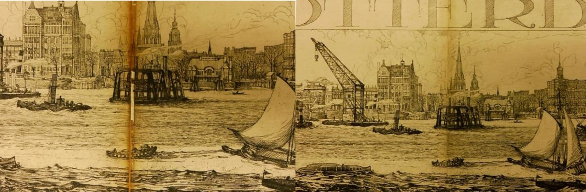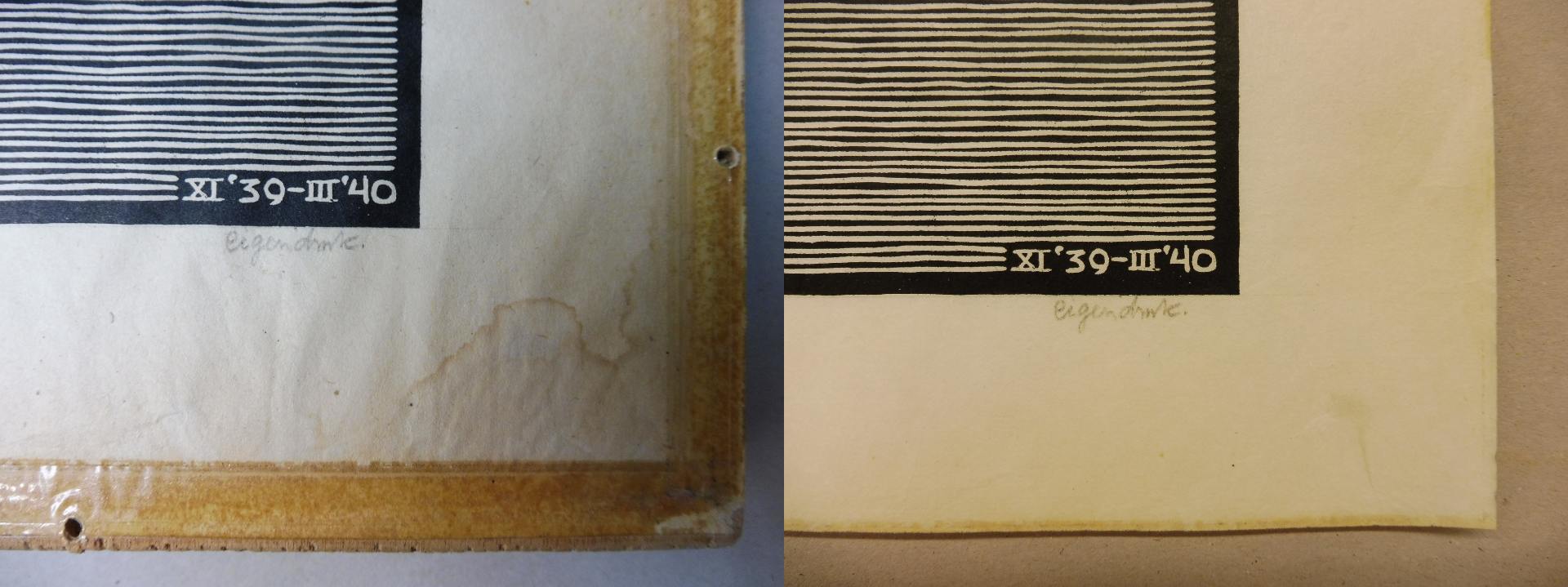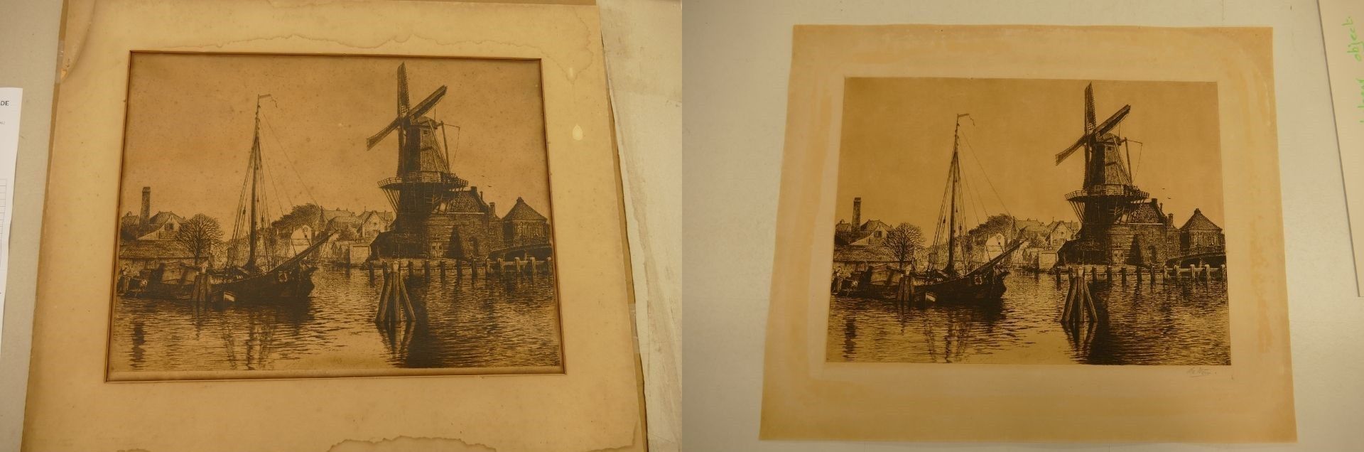Deze boekband van kalfsleer heeft waterschade gekregen, de platten zijn gaan golven en de rug is aangetast en kapot gegaan. Door middel van een licht vochtige sandwich is het plat van het boek weer gevlakt, De schade aan het leer is hersteld met zelf gekleurd kalfsleer en met gekleurd Japans papier.