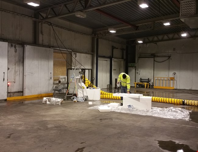 ”Polygon och AK-konsults uppdrag var att torka upp ytorna och leda ut överskottsfukt. Det var ett klassiskt klimatprojekt för en industri. Initialt fick vi vara lite extra kreativa. För att kunna placera torkmaskinerna rätt behövde vi bygga en provisorisk vägg i en av portarna mot lastkajen. Rören för att leda ut våtluften kunde då dras genom den provisoriska väggen väggen” berättar Peter Johansson Distriktschef TCS Stockholm.
