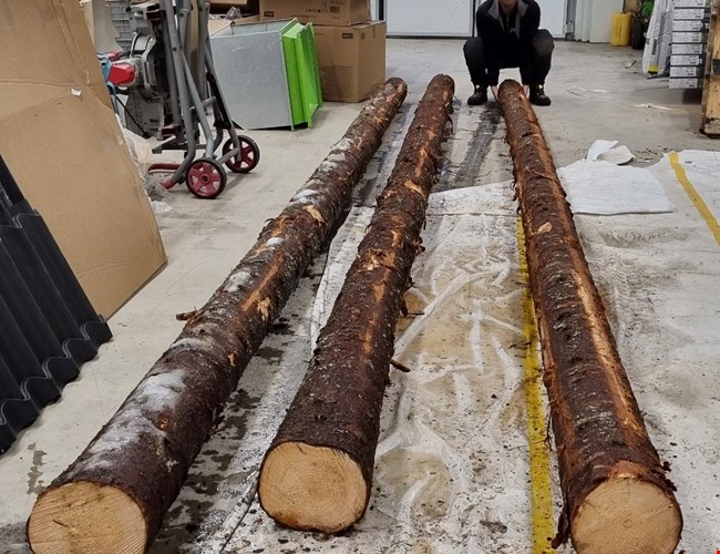 När Jonas Rönnqvist, fukttekniker på Polygon i Södra Norrland, kliver in i Rotabs lagerlokal doftar det fräscht av nykapad gran. “En ställning att placera stockarna på har byggts ihop och barken ska nu skalas från stammarna inför avfuktningen”, berättar han. “Vid en första mätning av de 600 x 30 cm stora stockarna väger de ca 200 kg styck och är genomblöta. Målet är att avfukta stockarna så pass snabbt och försiktigt att virket inte spricker onödigt mycket på grund av forcerad torkning”, förklarar Jonas.