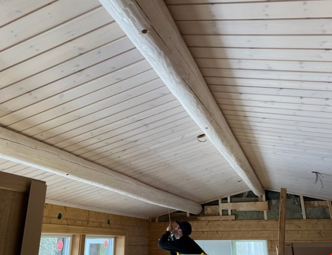 Det krävdes tre personer per stock att sätta upp dem i taket, men nu är de på plats. Slutkunden är nöjd med denna naturliga del i den nya moderna stugan och ser fram emot att flytta in igen.